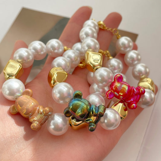 Pulsera Perlas Blancas Oso Rojo Tornasol 1W7