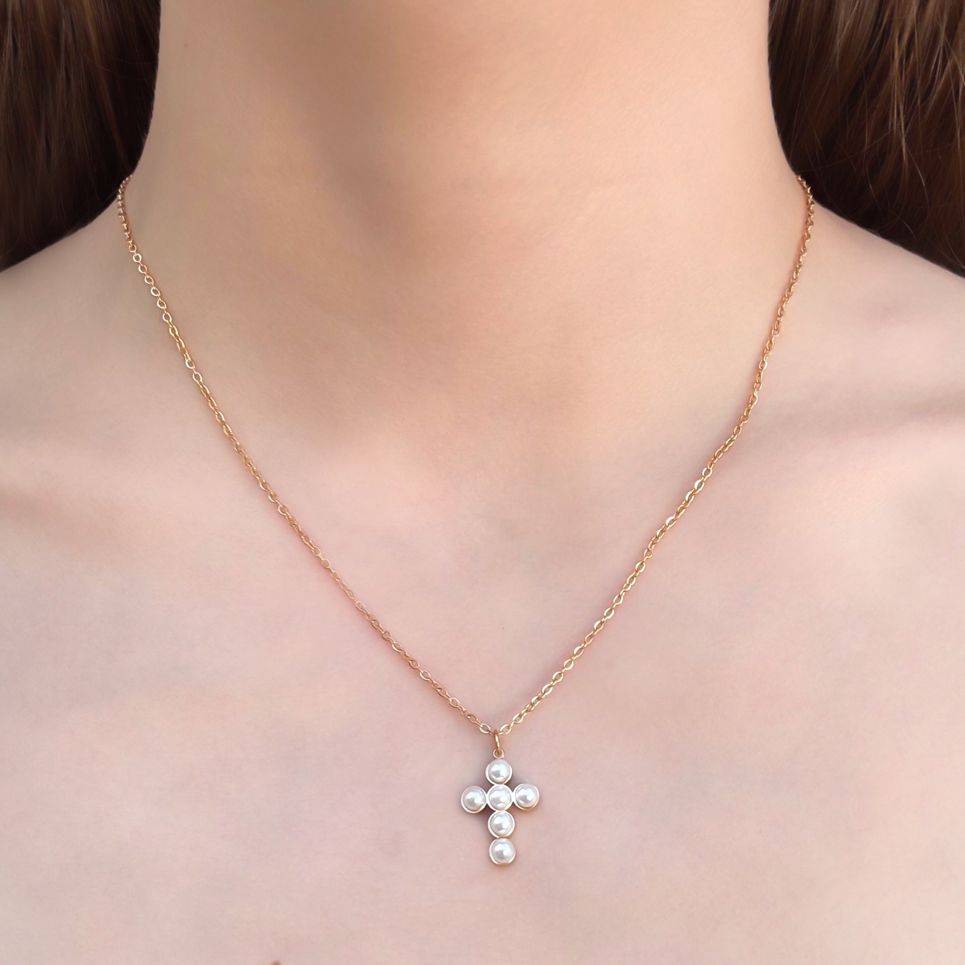 Collar Dorado Cruz Perlas Acero Inoxidable 3H1
