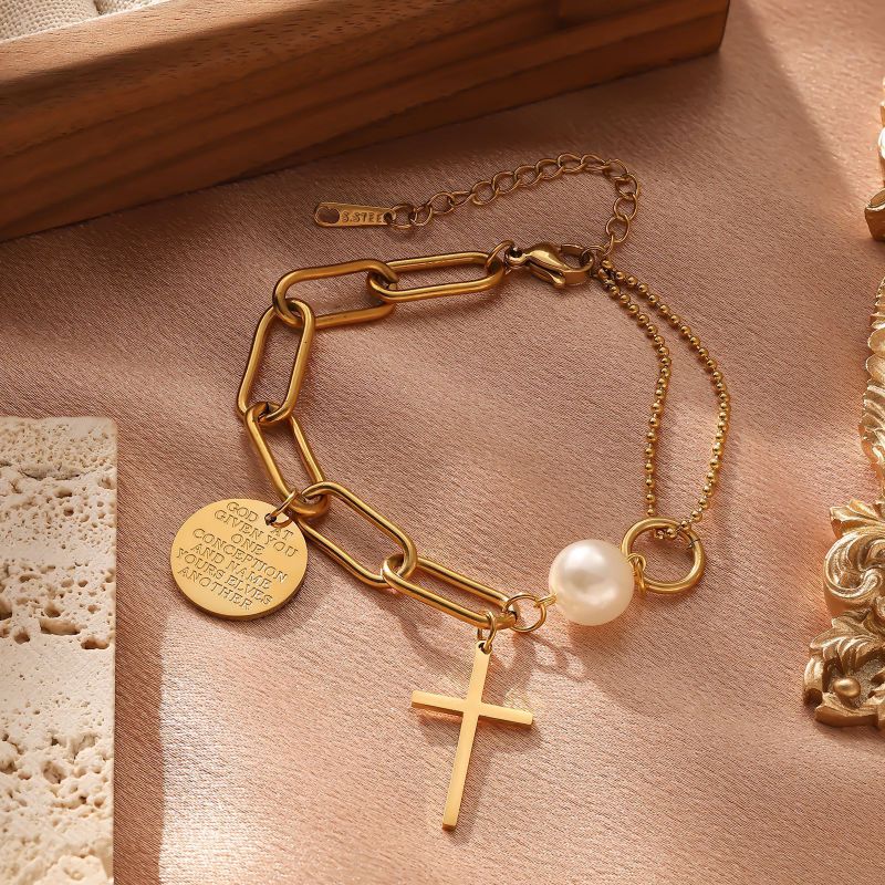 Pulsera Dorada Cruz Perla Medalla Acero Inox 1U4
