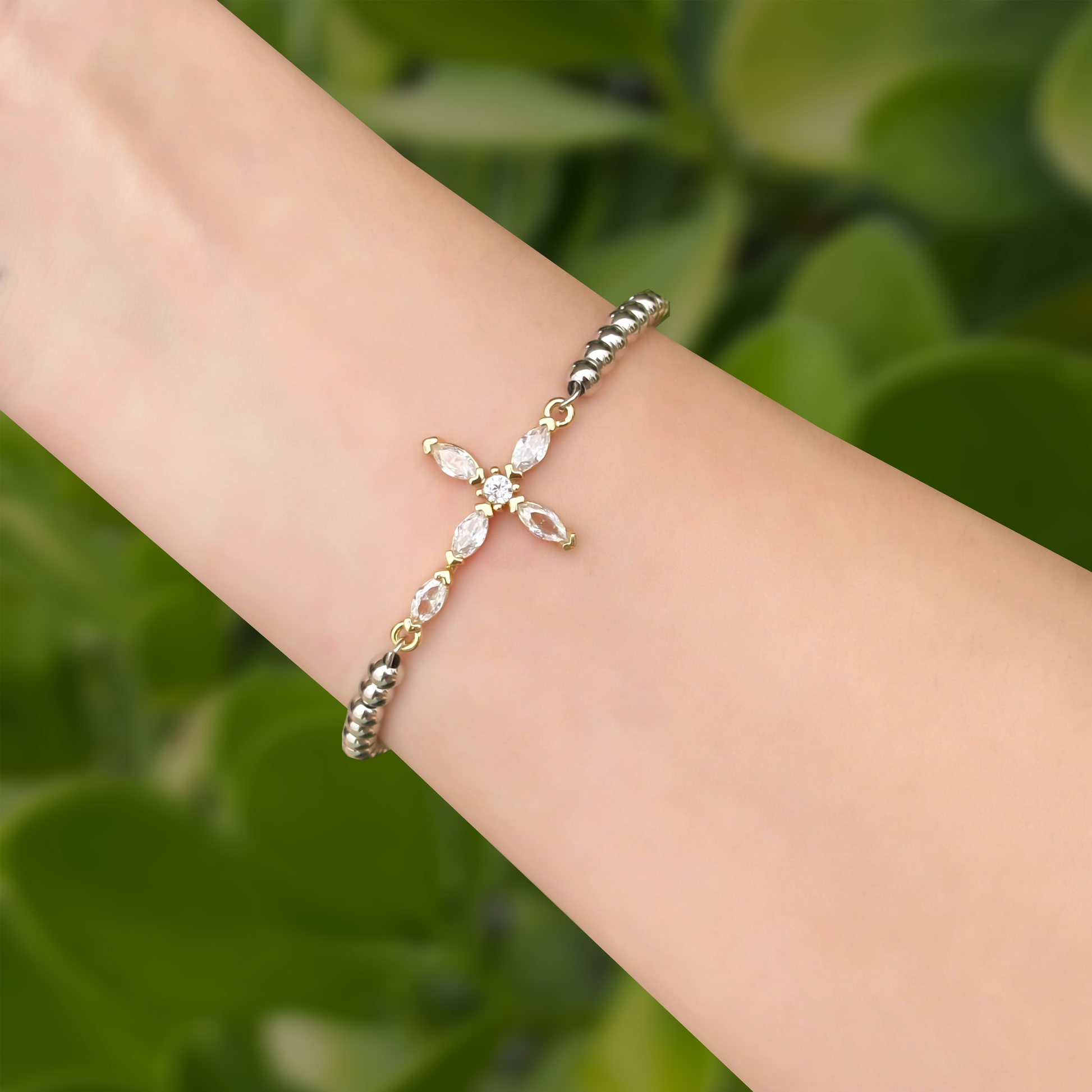 Pulsera Oro-Plata Bolitas y Cruz Zirconias 1o5