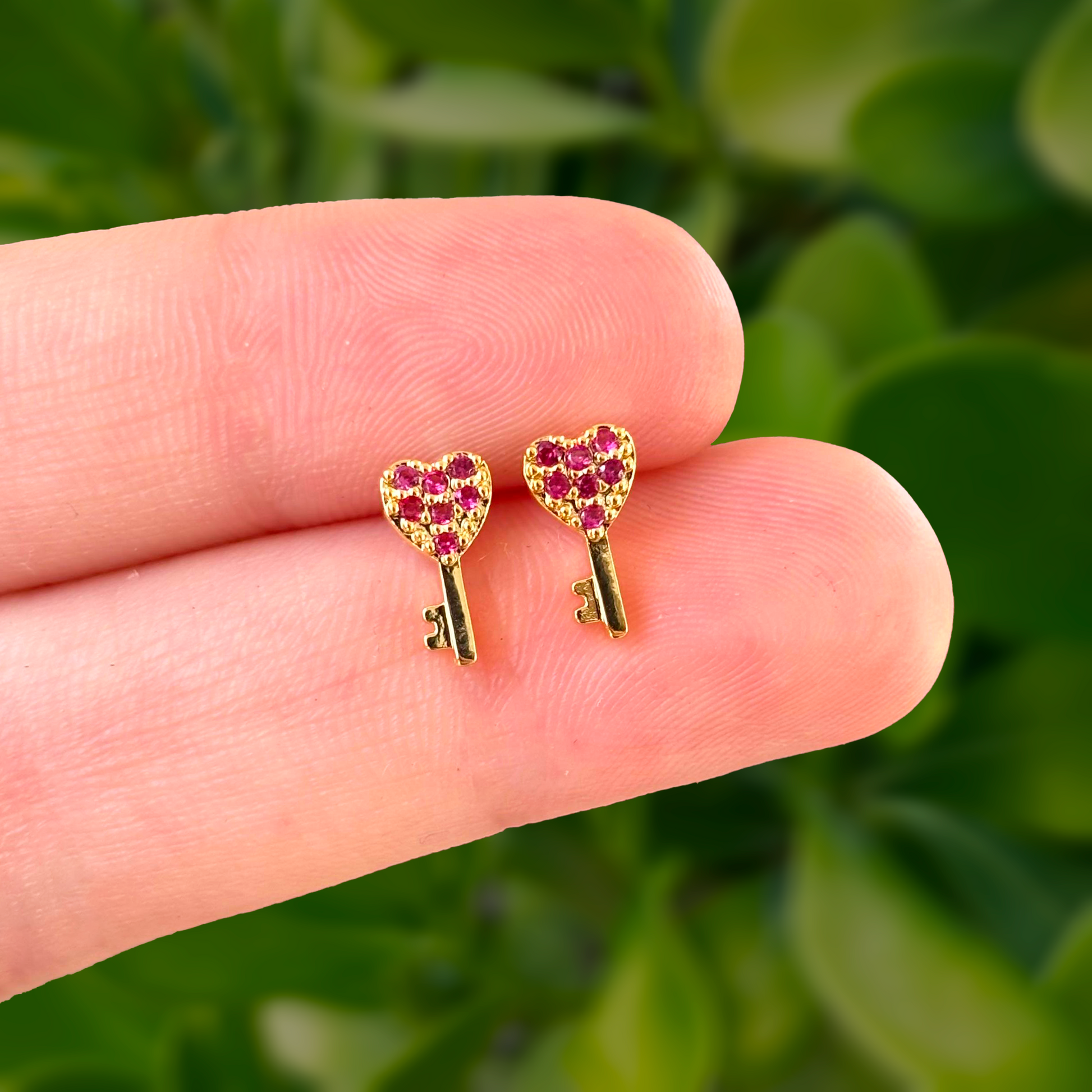Aretes Corazon Llave Magenta Chapa de Oro AZ4