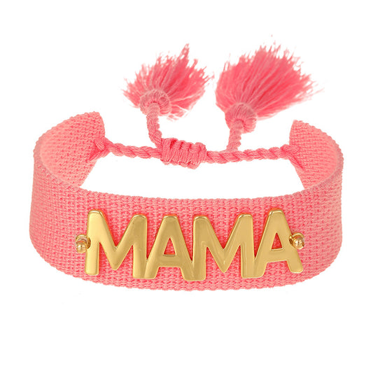 Pulsera Mamá Tela Rosa y Chapa de Oro 3H1