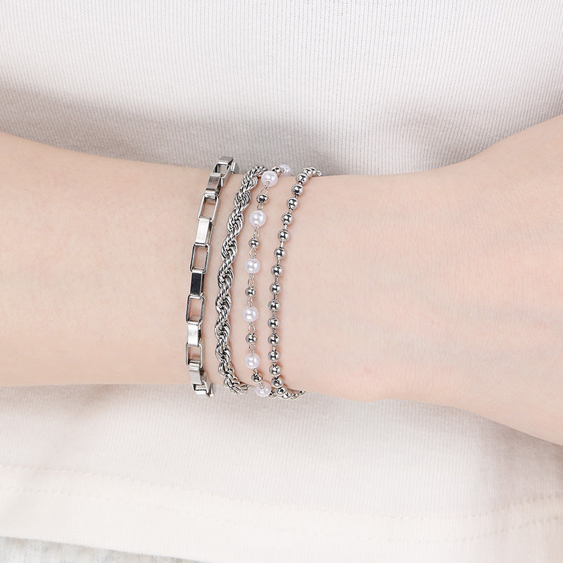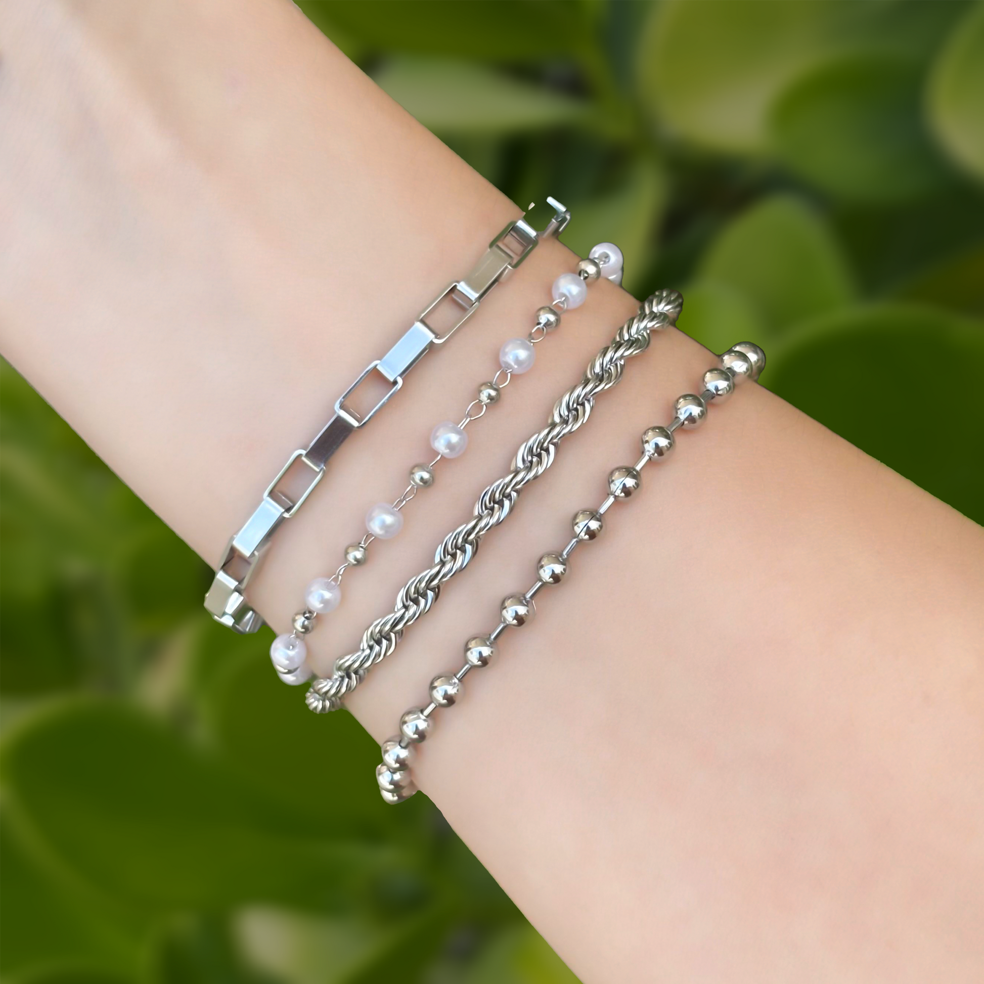 Set Pulseras 4pzs Plateadas Perlitas Acero Inoxidable 1C7